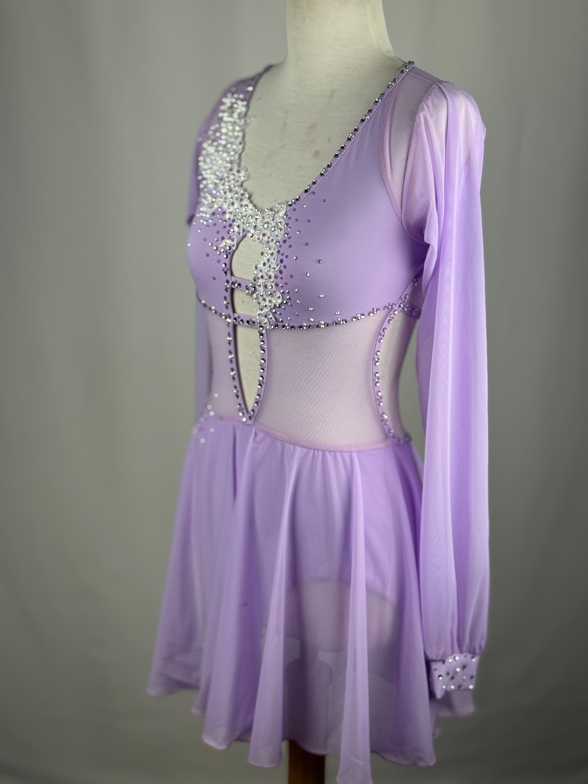 This costume features an elegant Lilac mesh fabric with white appliqués and over 8 gross of rhinestones (1200+ stones).