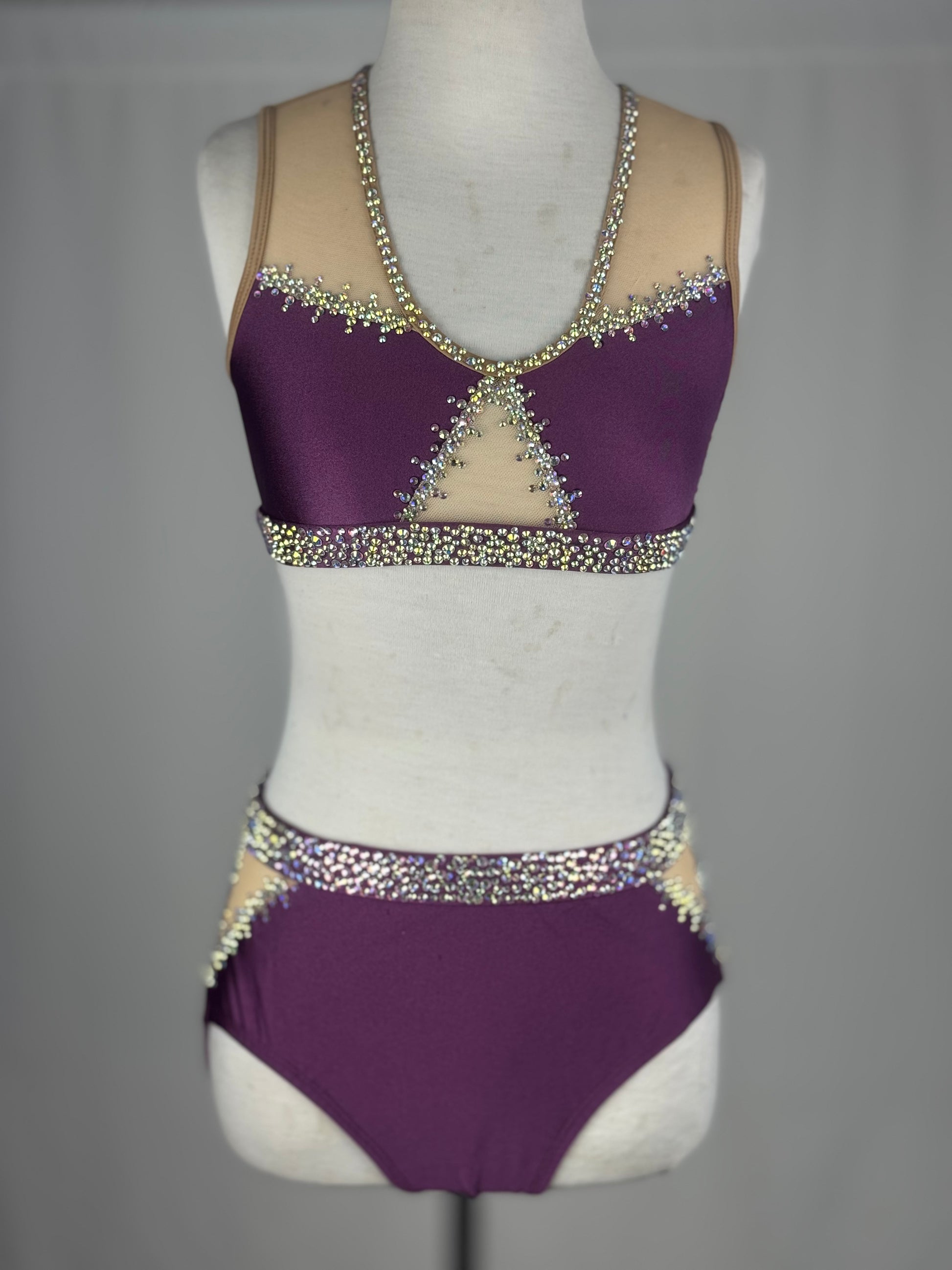 This costume features a jewel tone mauve/purple shade of fabric, with tan mesh cutouts and over 15 gross of rhinestones (2000+).