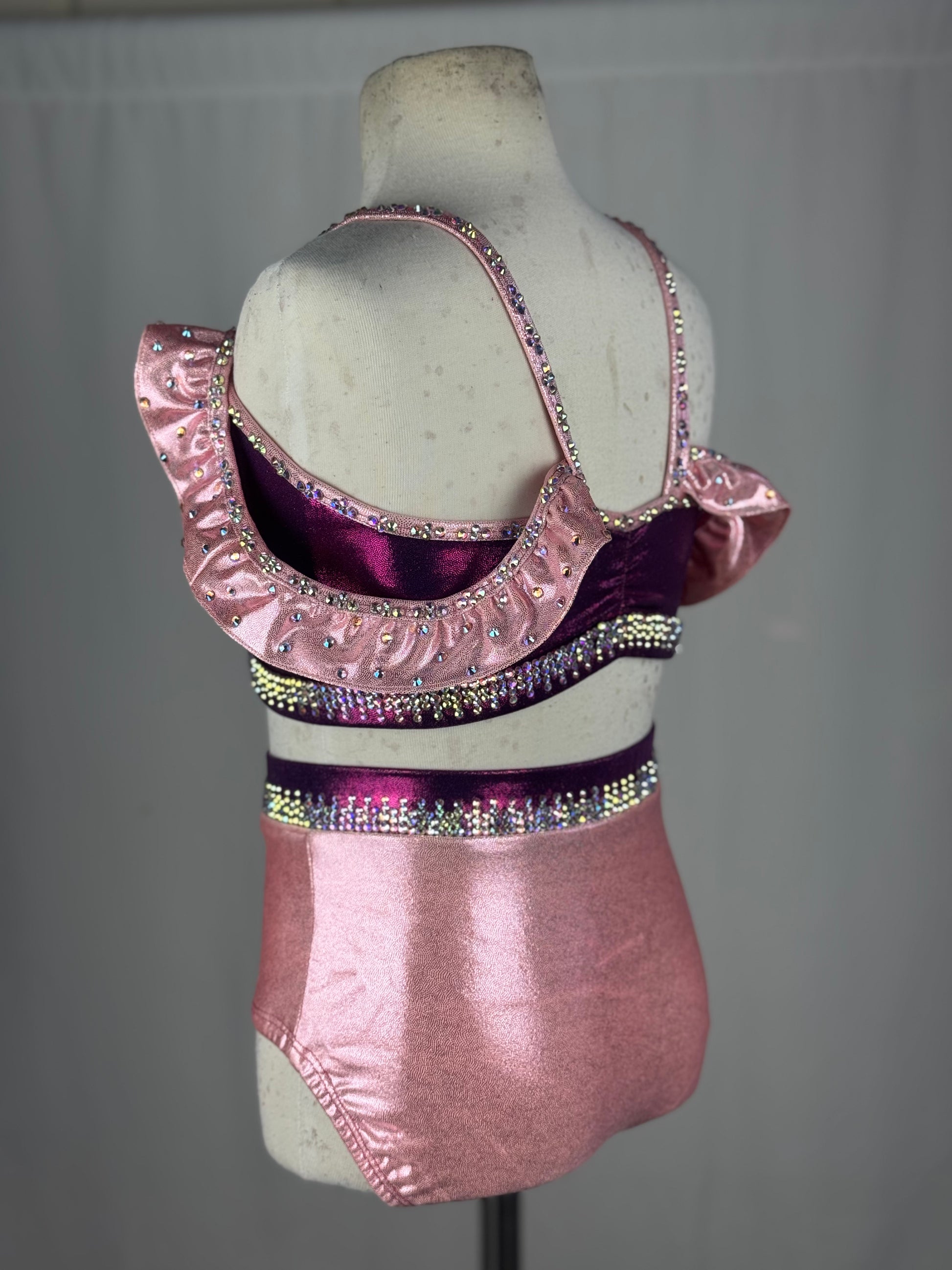 This costume features pink & hot pink two-piece design using metallic spandex. Over 9 gross rhinestones have been applied to this costume!